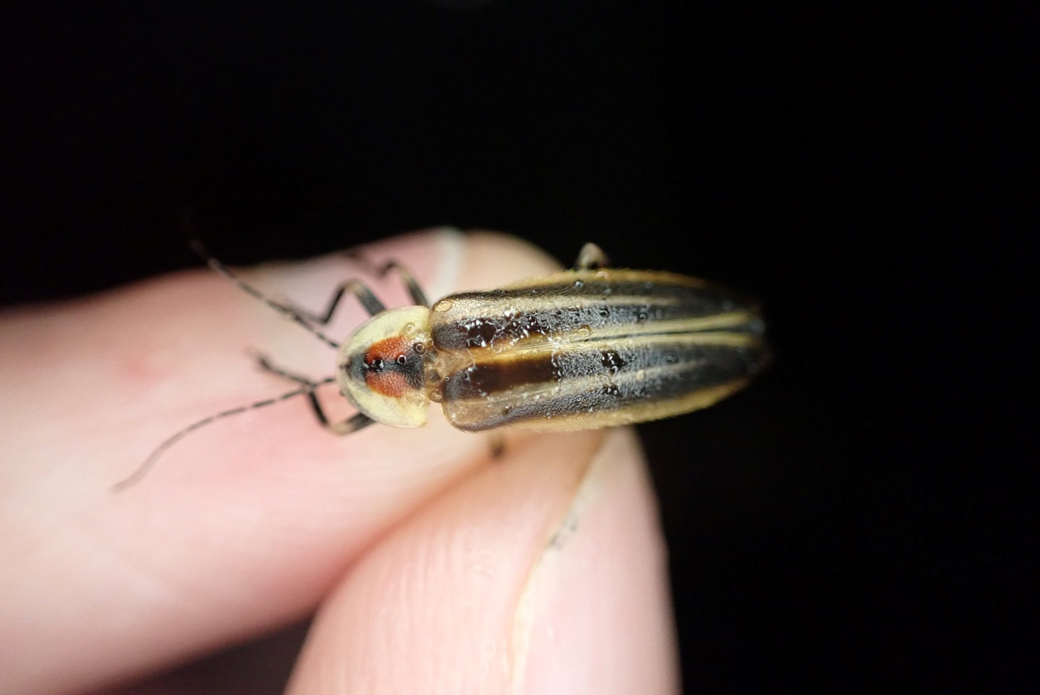 About 14 mm long. Dark hind coxae. Was giving repeating a multi-pulse (~5) flash pattern in flight.