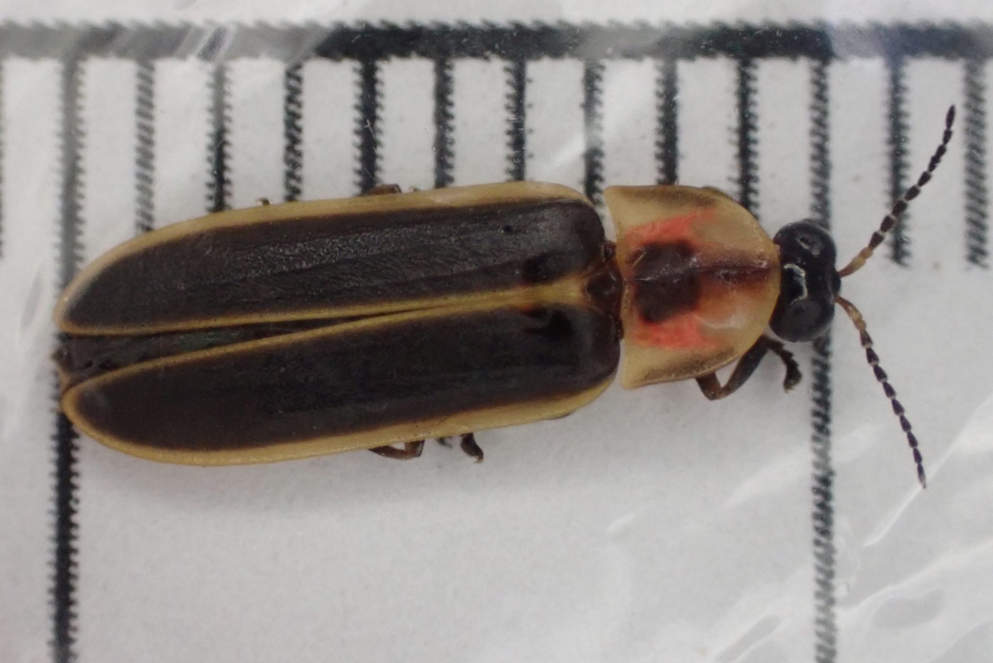 Male captured at 9:40 PM was about 9.5 mm long. Precise flash details not recorded, but flash pattern was a long (>1 second) greenish glow emitted just above the field in a drifting trajectory.