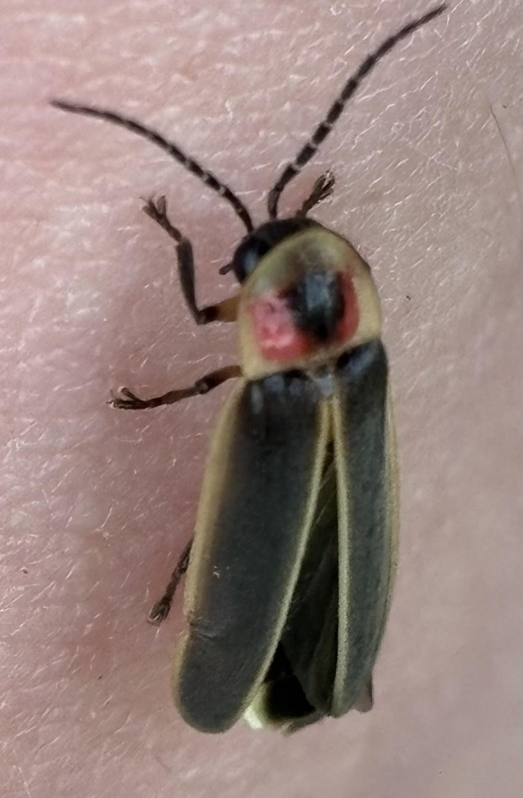 Based on the photo, this firefly is in the genus Photinus, and Photinus pyralis is the most likely species based on location and backyard habitat. Photos of the underside and flash pattern details would be helpful for confirming (Photinus pyralis does an upward swooping, “J-shaped” yellow flash every 4-6 seconds, often quite low over the grass.)