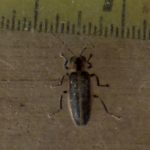 This firefly is in the genus Photuris and it is a male. Traits that point to Photuris include the green flash color (vs yellow in most Photinus and amber in most Pyractomena), the long legs, the hunched body posture (“shoulders” are higher than the head), and the markings on the head shield (pronotum).