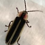 Based on the dark coloration of the scutellum (the little triangle where the wings meet, “between the shoulder blades”) and the rectangular shape of the dark marking on the head shield, this is a species other than Photinus pyralis– likely something in the Photinus consanguineus group, which includes species with single and double flash patterns.