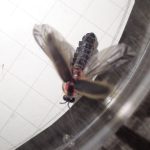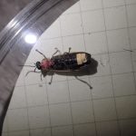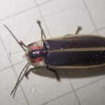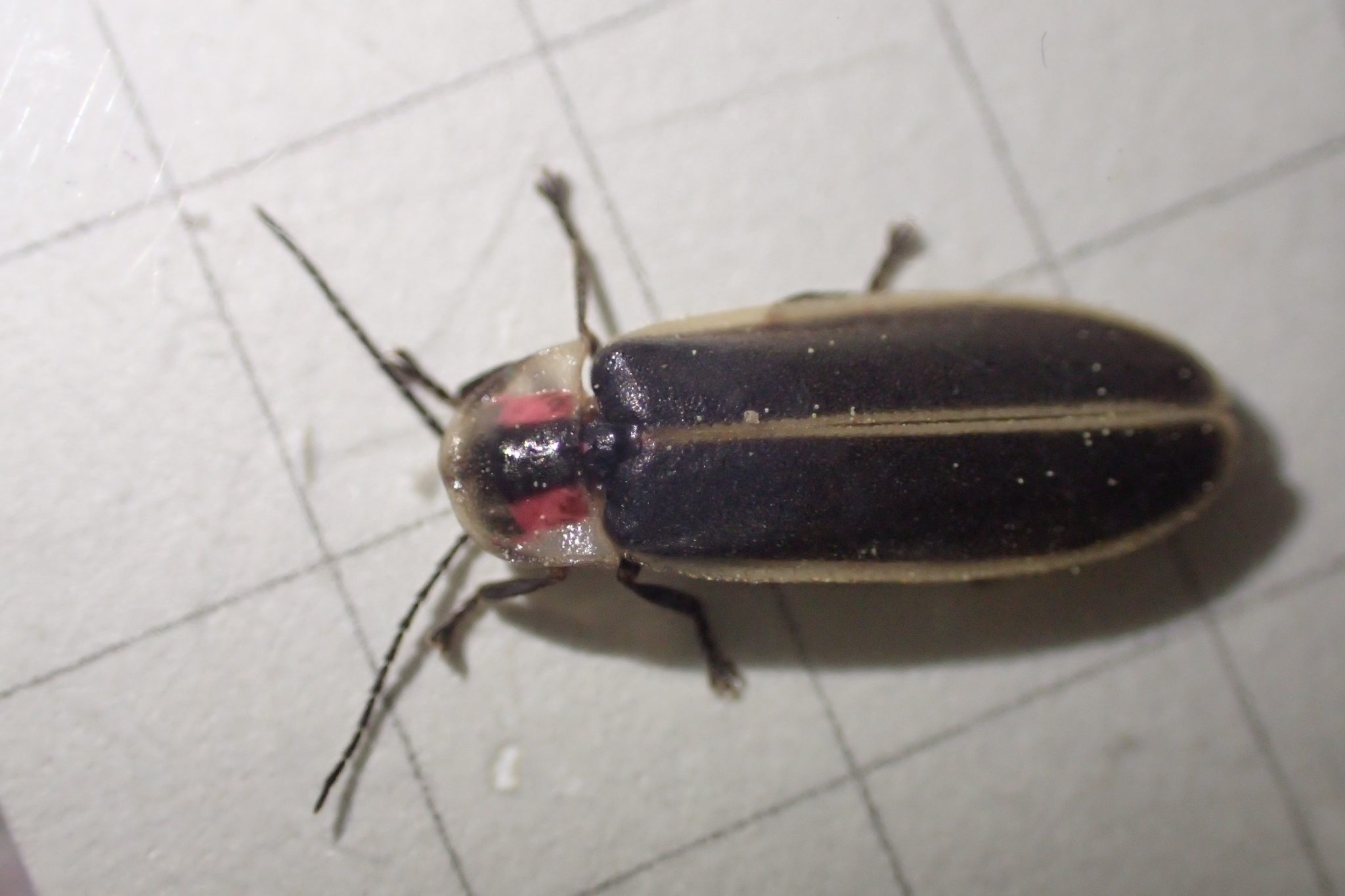 About 10 mm long (photographed on 5 mm square grid). Black scutellum, ventrites, and leg segments. Flying over marshy inlet of lake, emitting series of yellow flashes appearing to be flash trains of 3 at 3-second periods, some faster. Caught and photographed ~10:45 PM.